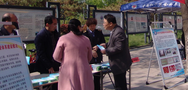 4月22日上午,曲阜市大沂河廣場上紅色的條幅在春日的照耀下異常鮮艷,白色的隔離衣穿插其間,這是曲阜市衛(wèi)生和計(jì)劃生育局以衛(wèi)生計(jì)生綜合監(jiān)督宣傳周活動(dòng)為契機(jī)