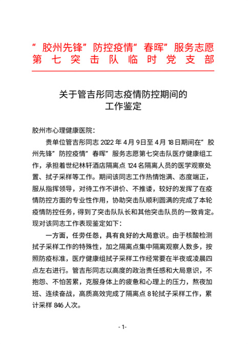 膠州市心理康復(fù)醫(yī)院管吉彤獲“膠州先鋒”疫情防控“春暉”志愿服務(wù)突擊隊(duì)表?yè)P(yáng)