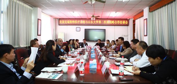 10月11日上午,美國克瑞斯特醫(yī)療集團副總裁Joseph Alex Valdez、Robert V ROSE Jr、Thomas Aloysius WILKEN、項目負責(zé)人Kai Xia以及中方項目總倡導(dǎo)人劉兆年等一行9人到山東大學(xué)第二醫(yī)院參觀交流,與