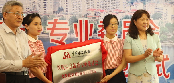 5月26日,中國(guó)醫(yī)院協(xié)會(huì)醫(yī)院信息統(tǒng)計(jì)專業(yè)委員會(huì)大數(shù)據(jù)應(yīng)用工作站在濟(jì)南市衛(wèi)生科技交流服務(wù)中心掛牌。 揭牌儀式 (右一: 國(guó)家衛(wèi)計(jì)委信息辦副主任高燕婕 ) 會(huì)議由