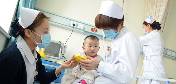 山東省淄博市中西醫(yī)結(jié)合醫(yī)院心腦血管外科的護理人員正在和免費實施先心病手術(shù)的孩子互動游戲。